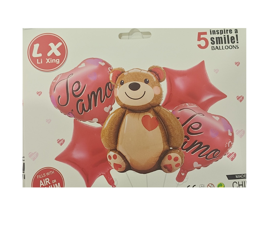 Kit decorativo de 5 globos foil diseñado exclusivamente para aire, perfecto para crear ambientes festivos en ocasiones especiales. Presenta un adorable oso acompañado de corazones que transmiten calidez y afecto. Ideal para San Valentín, aniversarios, o cualquier celebración que merezca un toque romántico y tierno. Su composición en material foil garantiza durabilidad y un acabado brillante que realza la decoración. Fácil de inflar y posicionar, este kit transforma cualquier espacio en un ambiente memorable y emotivo. Perfecto para regalar o decorar tu propio evento especial.